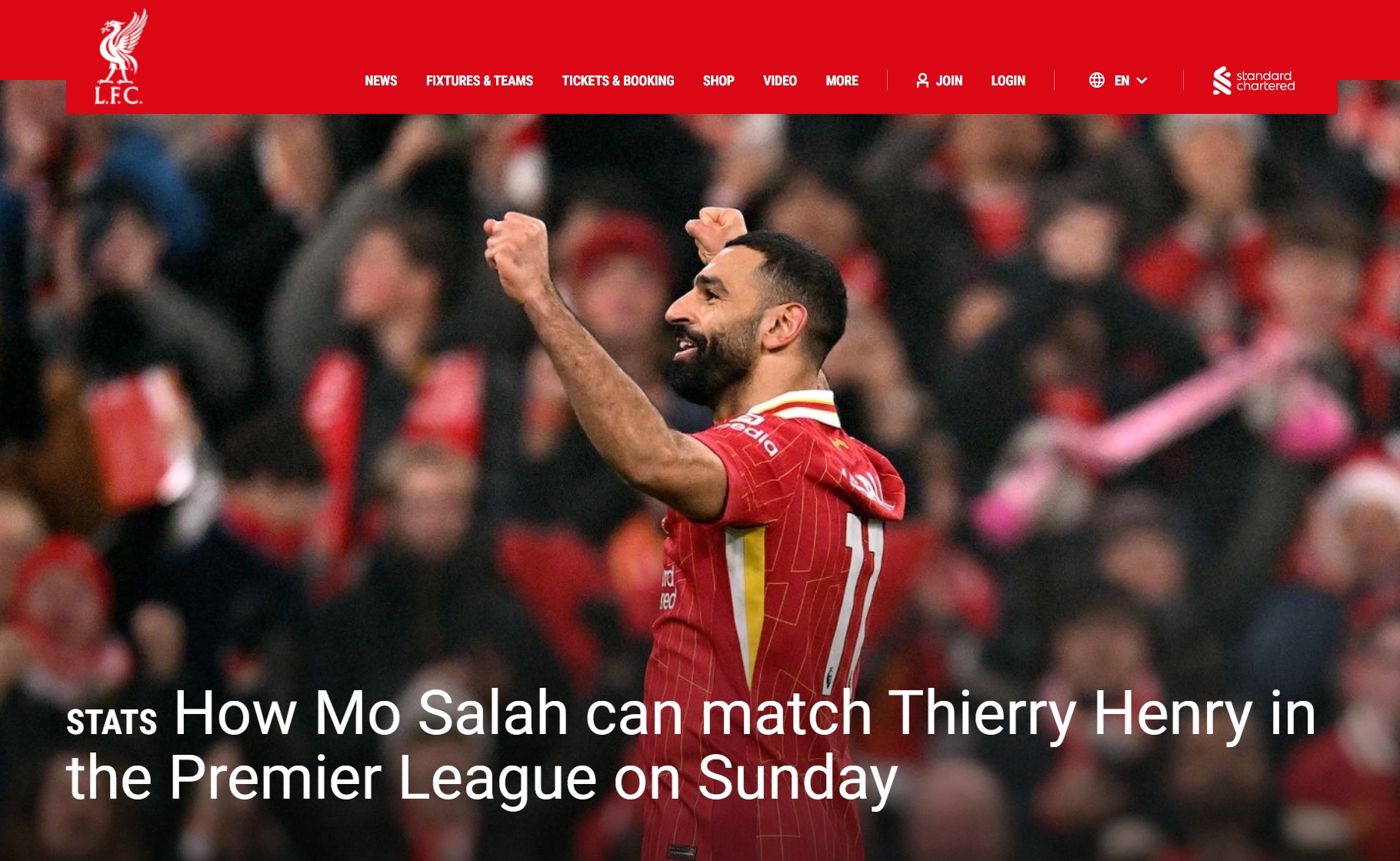 利物浦官網(wǎng)寫道:本周末對陣曼聯(lián)的比賽中,薩拉赫只要再攻入一球,就能在英超歷史射手榜上追平亨利,以175球并列英超歷史射手榜第7位。