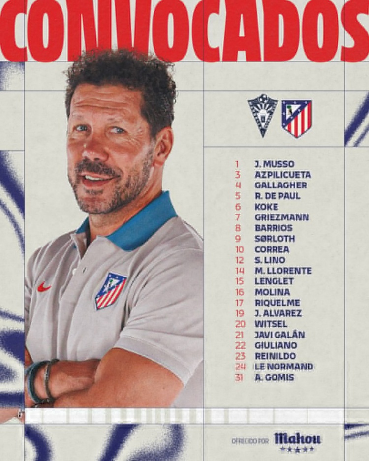 前鋒:7-格列茲曼、9-索爾洛特、10-科雷亞、12-利諾、19-阿爾瓦雷斯、22-朱利亞諾-西蒙尼