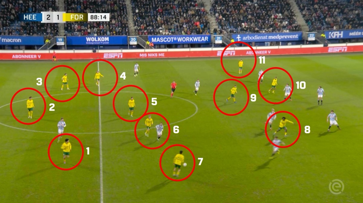 比賽踢到第87分鐘,海倫芬還以2-1領(lǐng)先。福圖納隊進行了兩次換人,但在其中一次換人后,被換下的人沒有離開,還是留在了場上。于是場上出現(xiàn)了12vs11的怪異景象。很快,福圖納在場上有12名球員的情況下獲得了一個角球,此時裁判才發(fā)現(xiàn)問題,讓場上恢復為11vs11。而福圖納利用這個角球扳平了比分。
