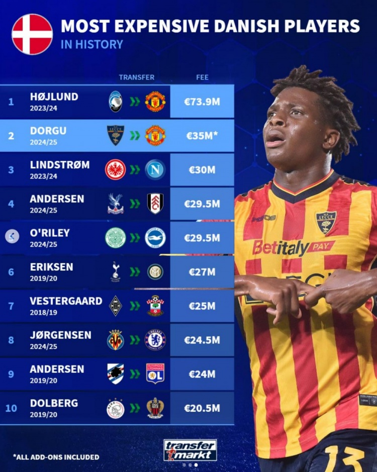 2月2日訊 曼聯(lián)正式官宣簽下多古,總價3500萬歐,德轉(zhuǎn)也盤點了丹麥球員歷史轉(zhuǎn)會費榜,其中霍伊倫居首,多古次席,具體如下: