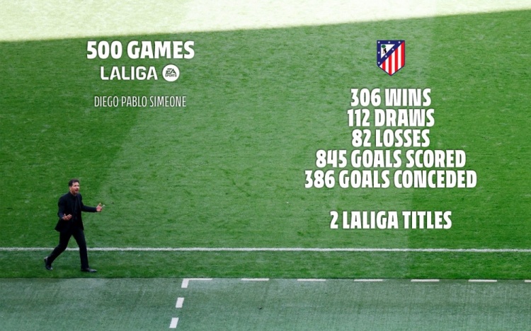 據(jù)馬競統(tǒng)計(jì),在這500場比賽中,西蒙尼收獲了306勝112平82負(fù)的出色戰(zhàn)績,一共打進(jìn)845球、丟掉386球。