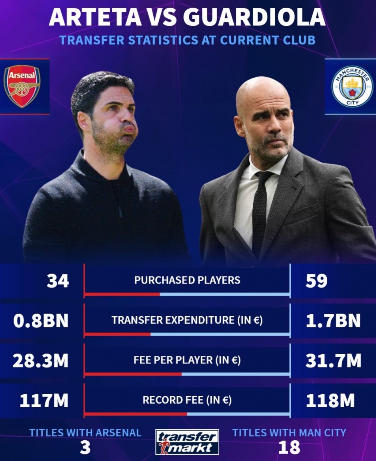 2月2日訊 阿森納和曼城將在本輪英超焦點(diǎn)戰(zhàn)狹路相逢,《轉(zhuǎn)會(huì)市場(chǎng)》對(duì)比了兩隊(duì)主帥建隊(duì)投入情況。