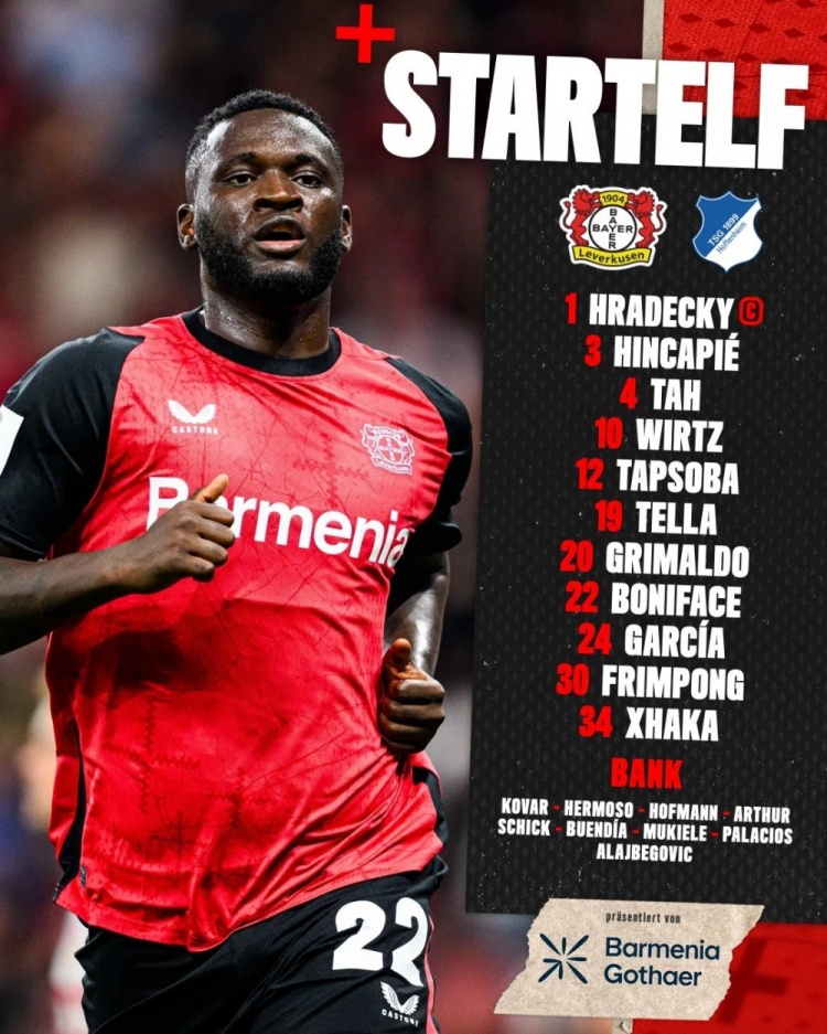 勒沃庫森首發(fā):1-赫拉德茨基、3-因卡皮耶、4-若納坦-塔、10-維爾茨、12-塔普索巴、19-泰拉、20-格里馬爾多、22-博尼法斯、24-阿萊克斯-加西亞、30-弗林蓬、34-扎卡