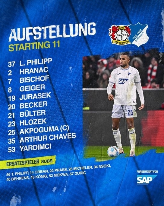 霍芬海姆替補:蒂姆-菲利普、奧爾班、普拉斯、米歇爾、恩索基、亨內(nèi)斯-貝倫斯、諾亞-柯尼希、大衛(wèi)-穆庫瓦、盧卡-杜里奇