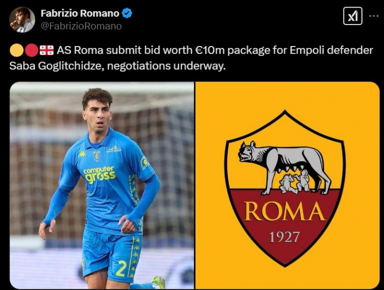 2月2日訊 據(jù)知名轉(zhuǎn)會專家羅馬諾報(bào)道,羅馬為恩波利后衛(wèi)薩巴-戈利希澤正式提出總額1000萬歐報(bào)價(jià),談判正在進(jìn)行之中。