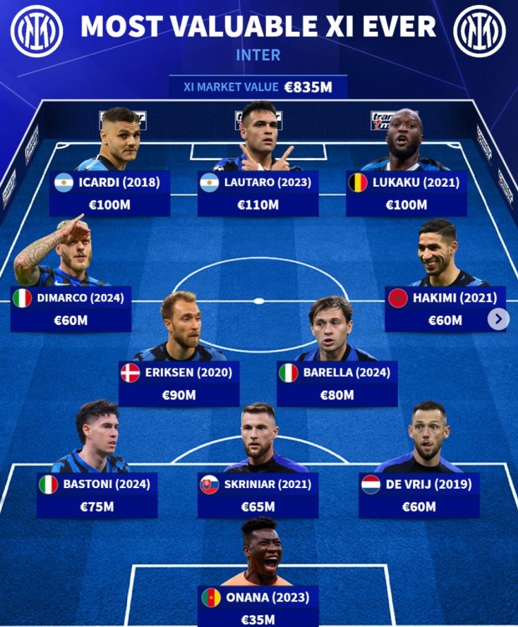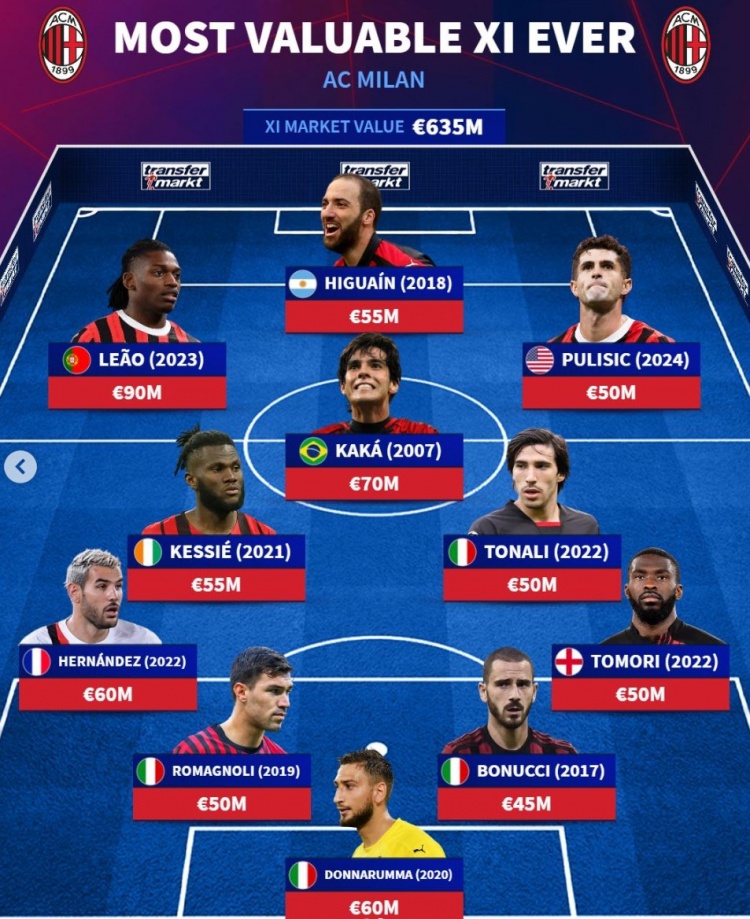米蘭歷史最貴陣:總身價(jià)6.35億歐元