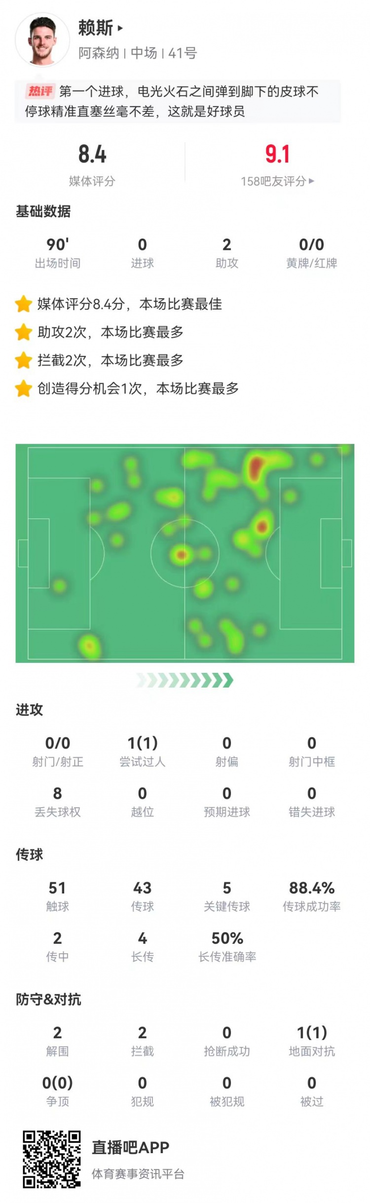發(fā)布時(shí)間:2025年02月03日 02:50點(diǎn)擊:欄目:足球新聞 2月3日訊 阿森納在本輪英超焦點(diǎn)戰(zhàn)5-1大勝曼城,賴斯本場數(shù)據(jù)如下:首發(fā)踢滿全場2助攻預(yù)期助攻0.1951觸球43傳球、38成功,成功率88%5關(guān)鍵傳球2傳中、0成功4長傳、2成功1創(chuàng)造重大機(jī)會(huì)1過人、1成功1對抗、1成功8丟失球權(quán)2解圍2攔截獲評8.4分全場最高 除特別注明外,本站所有內(nèi)容均為九球直播整理排版,轉(zhuǎn)載請注明出處:賴斯本場2助攻+5關(guān)鍵傳球+2解圍2攔截 獲評8.4分全場最高 本文標(biāo)簽: 足球 英超 阿森納 曼城