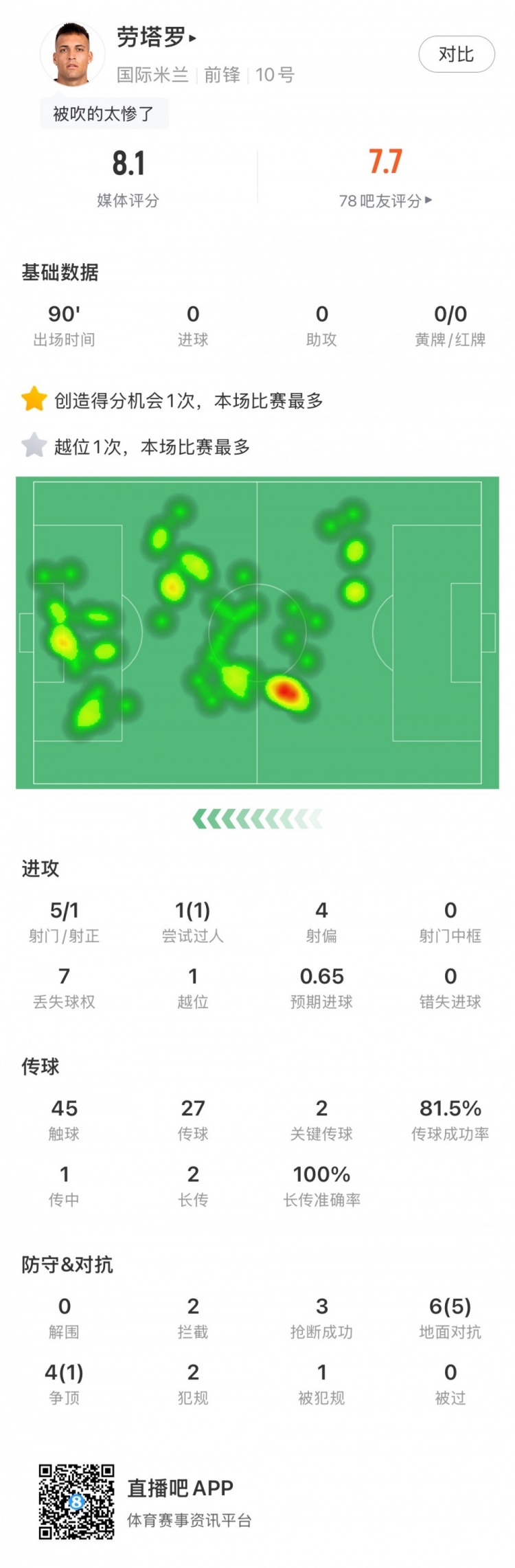 本場比賽勞塔羅為國米首發(fā)出戰(zhàn),全場比賽下來他有三次進(jìn)球被吹,上演另類“帽子戲法”。最終他收獲8.1的評分,為全隊第二高,僅次于扳平比分的德弗里。