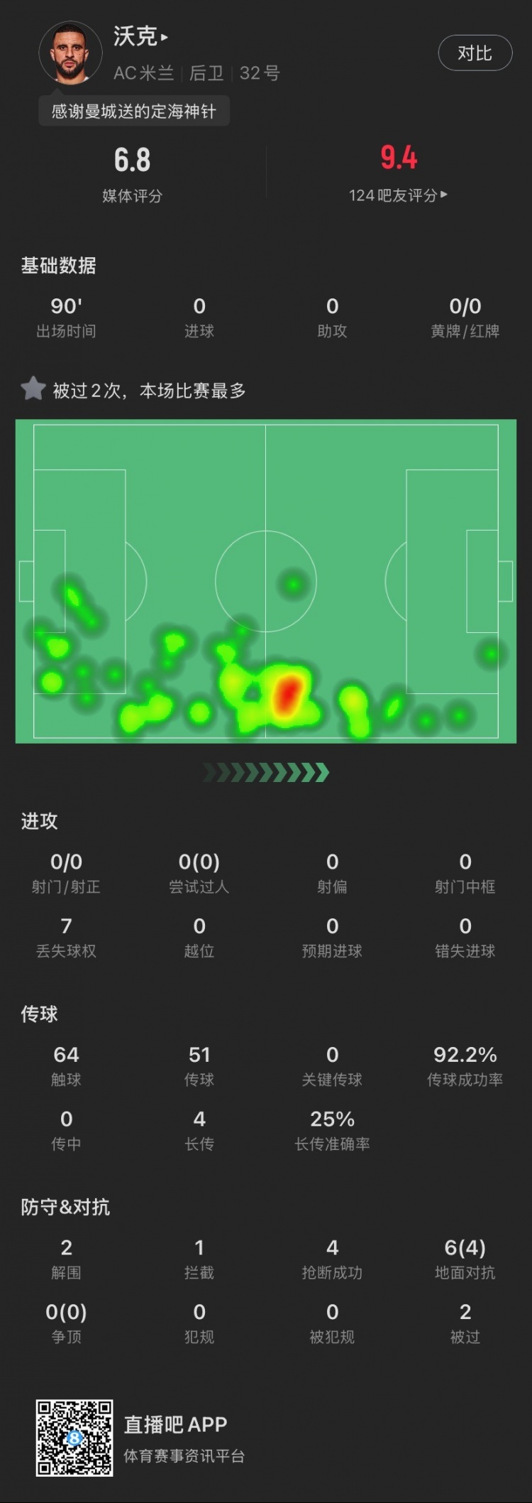 2月3日訊 在剛剛結(jié)束的米蘭德比中,米蘭1-1遭國米絕平。本場比賽,沃克迎來了自己的米蘭生涯首秀,最終獲評6.8分。