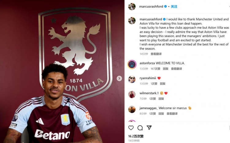 2月3日訊 維拉已經(jīng)官宣租借引進(jìn)曼聯(lián)前鋒拉什福德,后者也通過社媒發(fā)文。