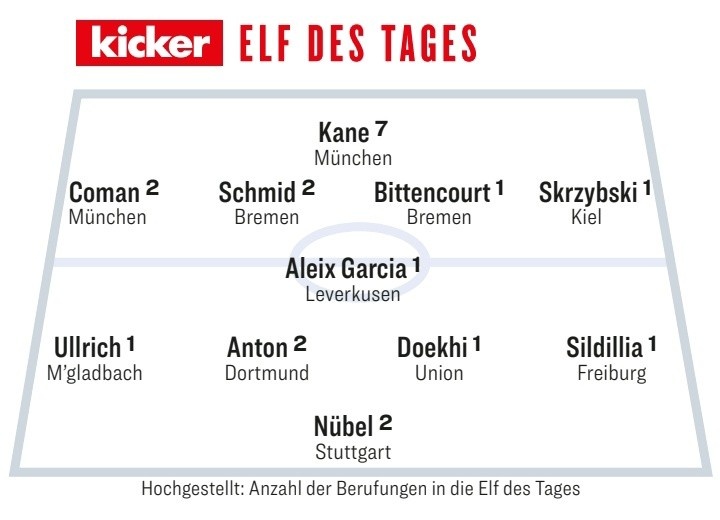 2月3日訊 德甲本輪比賽已經(jīng)全部完賽,《踢球者》也評(píng)出了本輪最佳陣容,拜仁和不萊梅各2將。