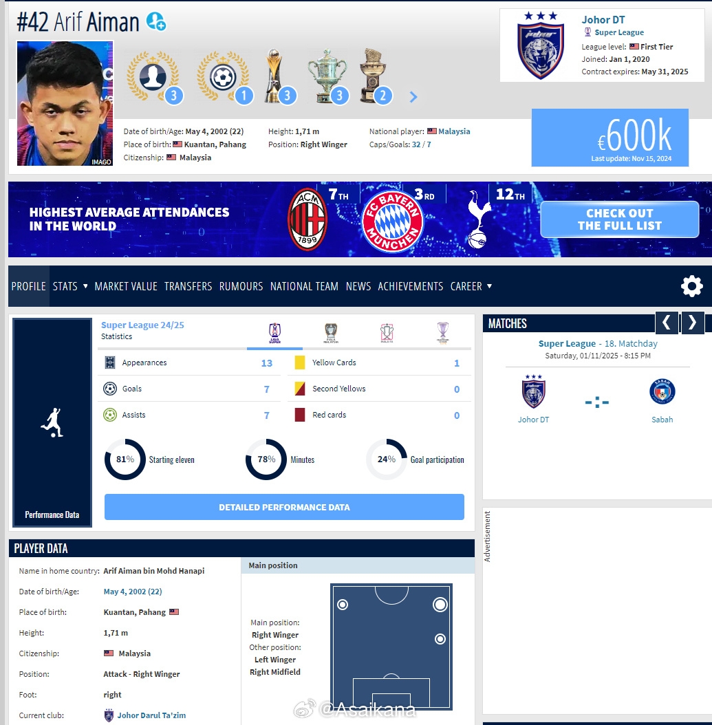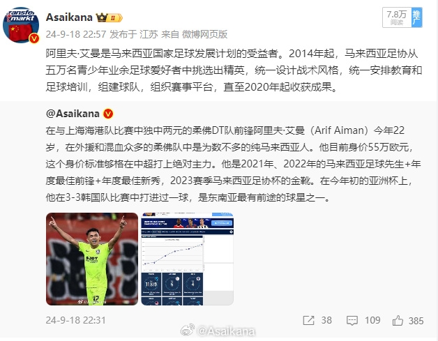 伊朗和馬來西亞媒體今天報(bào)道,柔佛隊(duì)中那個(gè)“唯一的純馬來西亞人”阿里夫·艾曼已經(jīng)吸引了伊朗豪門波斯波利斯的興趣。他今年22歲,在本賽季馬來西亞超級(jí)聯(lián)賽已經(jīng)出場(chǎng)13次打進(jìn)7球助攻7球,馬來西亞國(guó)內(nèi)的兩個(gè)杯賽他出場(chǎng)了12次打進(jìn)了7球,此外亞冠精英聯(lián)賽6場(chǎng)4球,包括令中國(guó)球迷印象深刻的打進(jìn)兩支上海球隊(duì)的3個(gè)進(jìn)球。去年7月他就曾和波斯波利斯有過傳聞。