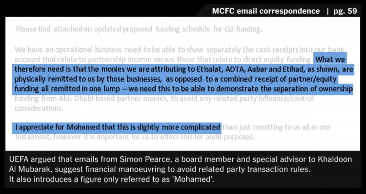 歐足聯(lián)表示,西蒙-皮爾斯的郵件中表明,為規(guī)避關(guān)聯(lián)交易規(guī)則,進行了一些財務(wù)操作。西蒙-皮爾斯是曼城董事會成員,也是穆巴拉克的特別顧問。郵件中還引入了一個叫做“穆罕默德”的代稱。
