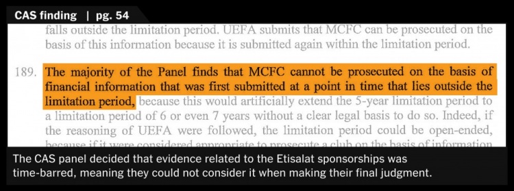 在CAS審理過程中,盡管最初曼城被認定違規(guī),但上訴委員會發(fā)現(xiàn),他們無法確保這些所謂的阿聯(lián)酋電信付款的合法性——因為它們已經(jīng)超過時效了。不過根據(jù)TA咨詢的法律專家表示,這對于英超聯(lián)賽處罰并不會造成阻礙。