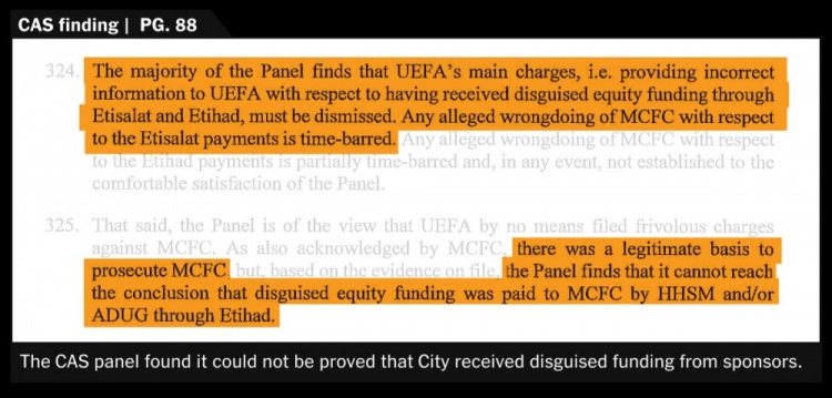 CAS三人小組中的兩人駁回了曼城通過伊蒂哈德航空和阿聯(lián)酋電信收到變相付款(或者說是“假贊助”)的主要指控,認為所有與阿聯(lián)酋航空付款有關(guān)的“證據(jù)”都已經(jīng)超過時效,伊蒂哈德航空的付款也是如此。并且無論如何,提供錯誤信息的指控尚未成立。