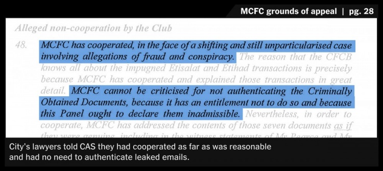 曼城律師告訴CAS,他們在合理的范圍內(nèi)進行了合作,不需要驗證泄露郵件的真實性。