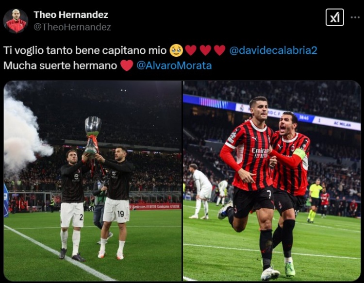 特奧社媒配文寫道:“我是如此愛你,我的隊(duì)長卡拉布里亞,也祝我的兄弟莫拉塔未來好運(yùn)!”
