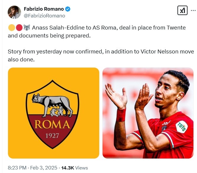 發(fā)布時間:2025年02月03日 20:50點擊:欄目:足球新聞 2月3日訊 羅馬諾報道,23歲左后衛(wèi)薩拉赫-埃丁將加盟羅馬,交易文件正在準備中。同時羅馬諾證實,羅馬也敲定了26歲中后衛(wèi)維克托-尼爾森。薩拉赫-埃丁效力特溫特,德轉身價500萬歐,本賽季出場29次,總計2234分鐘時間,貢獻2球4助攻。維克托-尼爾森效力加拉塔薩雷,德轉身價1400萬歐,本賽季他為球隊出場了18次,總計616分鐘出場時間。 除特別注明外,本站所有內容均為九球直播整理排版,轉載請注明出處:羅馬諾:羅馬敲定左后衛(wèi)薩拉赫-埃丁和中后衛(wèi)維克托-尼爾森 本文標簽: 足球 意甲 羅馬 荷甲