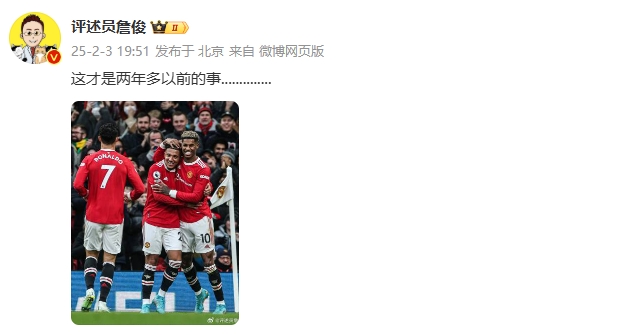 02月03日訊 詹俊曬出C羅、桑喬、拉什福德身著曼聯(lián)球衣的同框照,感嘆:這才是兩年多以前的事.............. ???