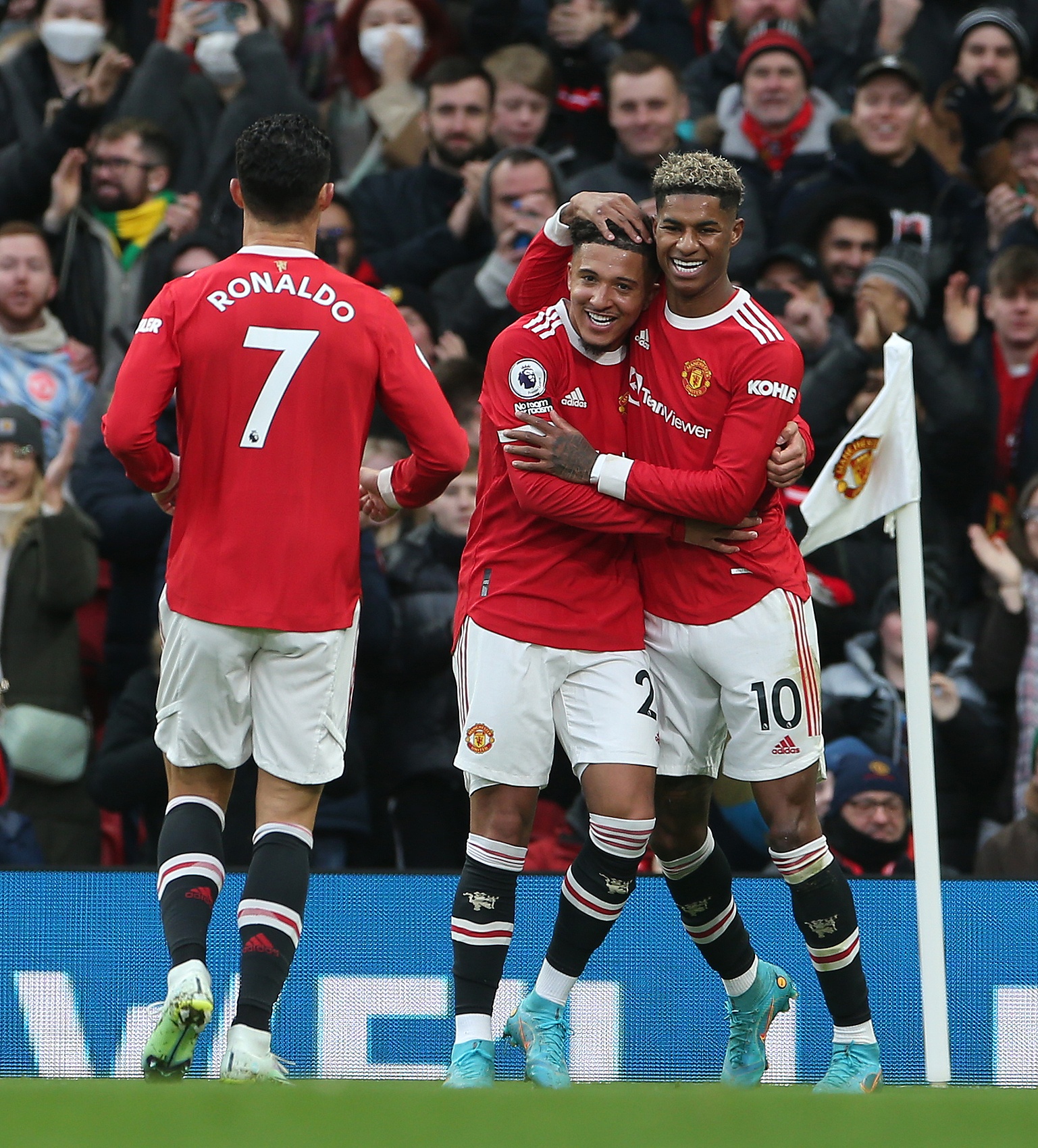 這張照片的場景發(fā)生于2022年2月12日,21/22英超第25輪曼聯(lián)1比1戰(zhàn)平南安普頓。那個賽季C羅代表曼聯(lián)出場38次打入24球,桑喬38場5球3助攻,拉什福德32場5球2助攻。