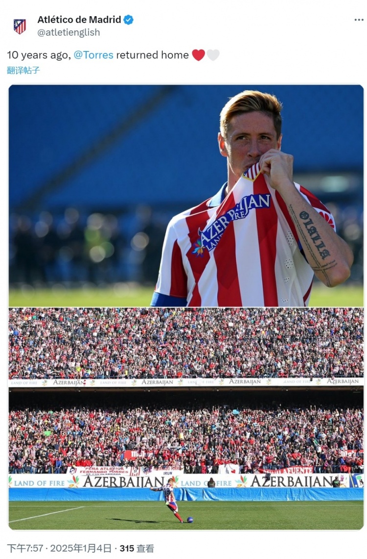 馬競官方社媒曬出托雷斯2015年回歸的照片,配文:“10年前的今天,托雷斯回家?!?/p>