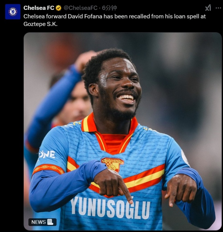 發(fā)布時間:2025年02月04日 01:50點擊:欄目:足球新聞 2月4日訊 切爾西官方宣布,22歲外租中鋒大衛(wèi)-福法納被召回。大衛(wèi)-福法納在9月外租土超俱樂部哥茲塔比,至今出戰(zhàn)9場打進2球。這也是他加盟切爾西后第3次被外租。22歲的大衛(wèi)-福法納司職中鋒也能客串邊鋒,2023年初以1200萬歐加盟切爾西共計出場4次,當前德轉身價850萬歐元。 除特別注明外,本站所有內容均為九球直播整理排版,轉載請注明出處:切爾西官方:召回22歲中鋒大衛(wèi)-福法納,上半程外租土超9場2球 本文標簽: 足球 英超 切爾西 轉會