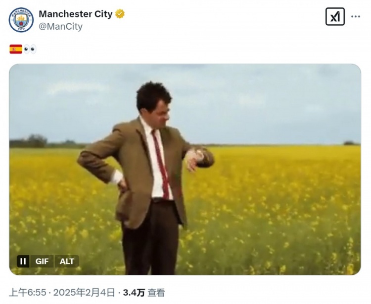 曼城官方社媒曬出憨豆先生焦急等待并看表的動(dòng)圖,配上了西班牙國(guó)旗,以及眼睛的表情符號(hào),預(yù)熱尼科-岡薩雷斯加盟,隨后曼城官宣了這筆交易。