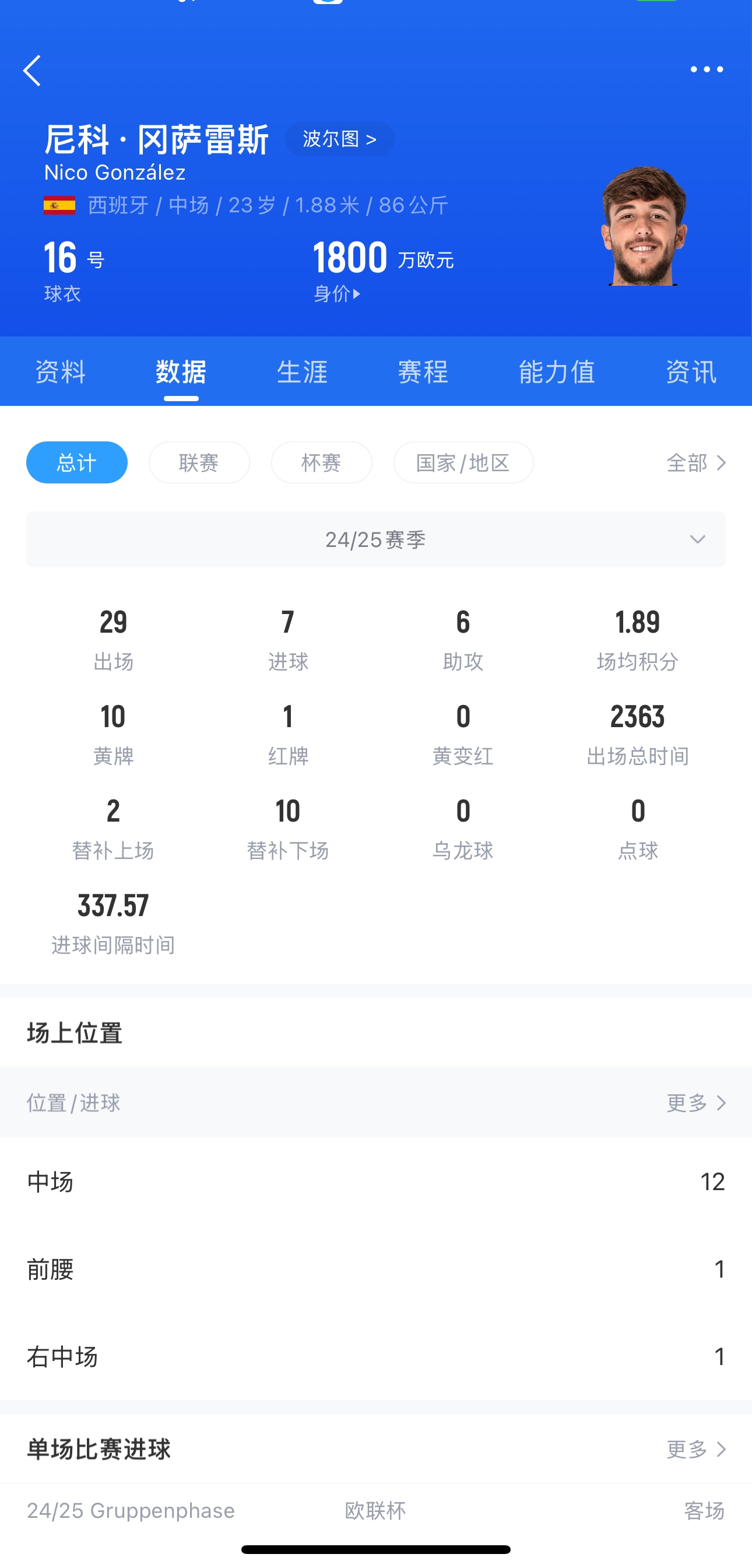 尼科-岡薩雷斯,現(xiàn)年23歲,西班牙中場,出自拉瑪西亞青訓(xùn),2023年夏窗波爾圖花費840萬歐簽下球員,本賽季尼科代表波爾圖出戰(zhàn)29場比賽,貢獻(xiàn)7球6助,目前球員德轉(zhuǎn)身價1800萬歐。