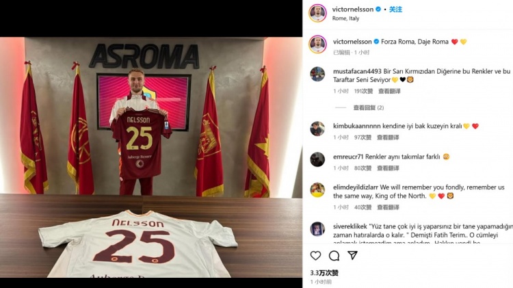 球員本人也通過(guò)社媒曬出自己手持25號(hào)羅馬球衣的簽約照,并配文:“羅馬加油,羅馬前進(jìn)!”