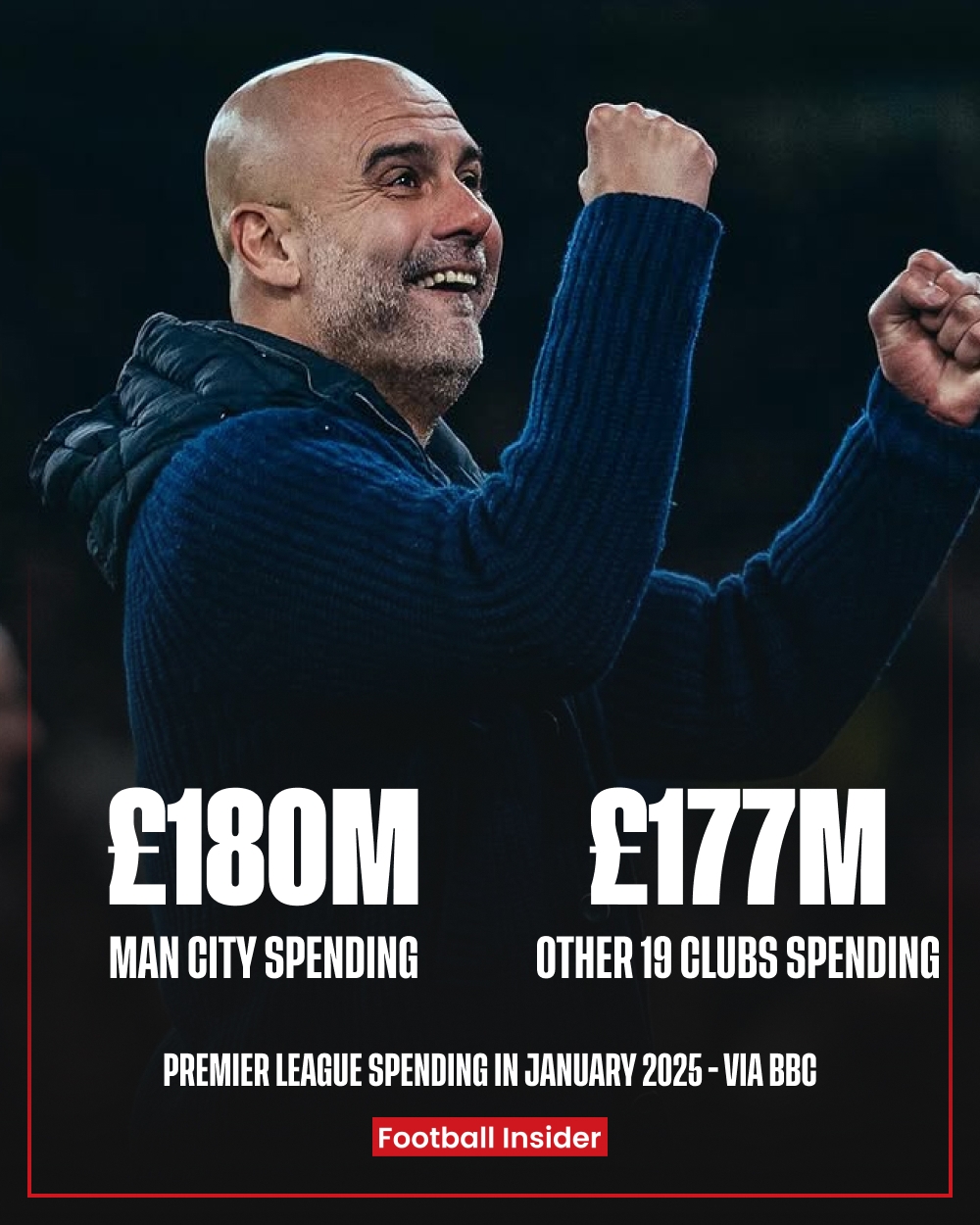 發(fā)布時(shí)間:2025年02月04日 19:50點(diǎn)擊:欄目:足球新聞 除特別注明外,本站所有內(nèi)容均為九球直播整理排版,轉(zhuǎn)載請(qǐng)注明出處:1>19!曼城冬窗豪擲1.8億鎊,英超其余19隊(duì)合計(jì)才花1.77億 本文標(biāo)簽: 足球 英超 曼城