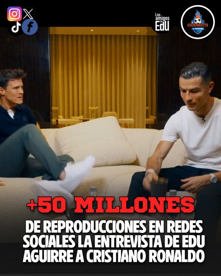 C羅接受西班牙六臺(tái)記者愛德華多-阿吉雷的專訪,西班牙六臺(tái)指出,這次專訪的視頻在各個(gè)社交平臺(tái)的點(diǎn)擊量已經(jīng)突破5000萬(wàn)。