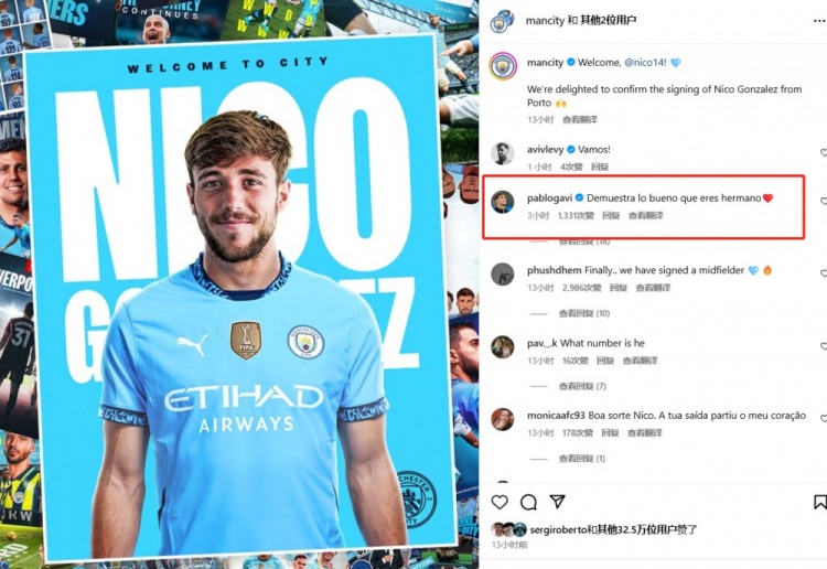 在尼科-岡薩雷斯和曼城官方的官宣動(dòng)態(tài)下,巴薩中場加維進(jìn)行了評論,向前隊(duì)友送上了祝福。