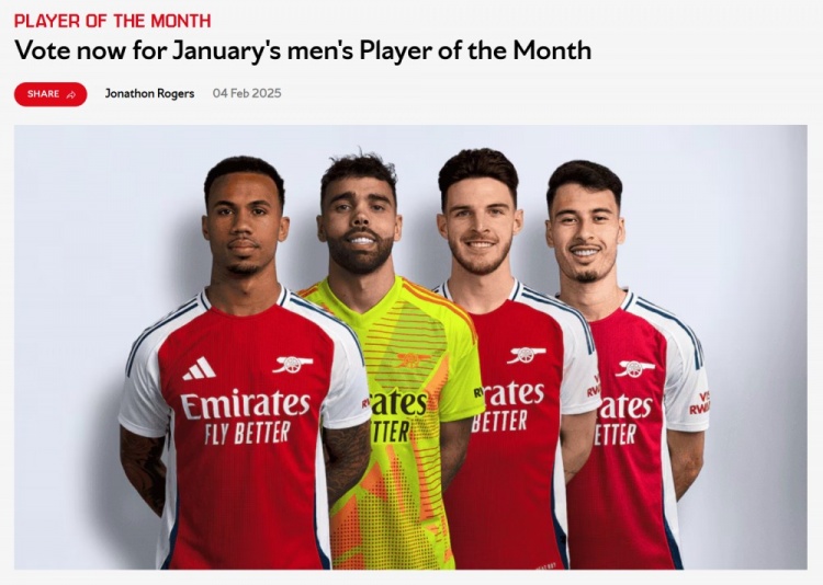 2月4日訊 阿森納官方公布1月隊(duì)內(nèi)最佳候選,加布里埃爾、拉亞、賴斯、馬丁內(nèi)利獲提名。