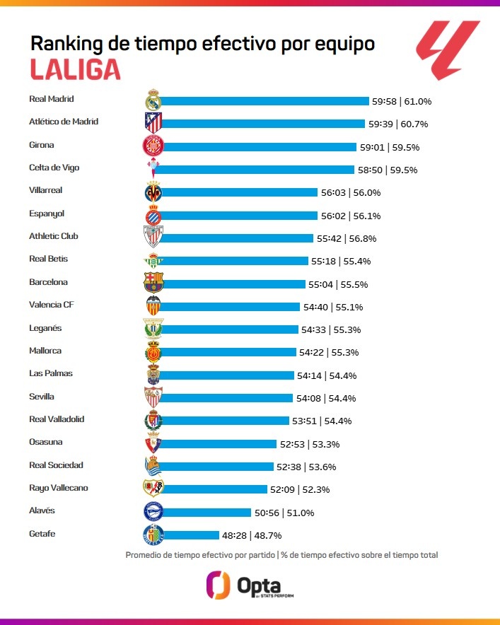 巴薩的場均凈比賽時長則以55:04位列第9,占比為55.5%。西甲場均凈比賽時長最短的是赫塔費,僅為48:28,占比48.7%。