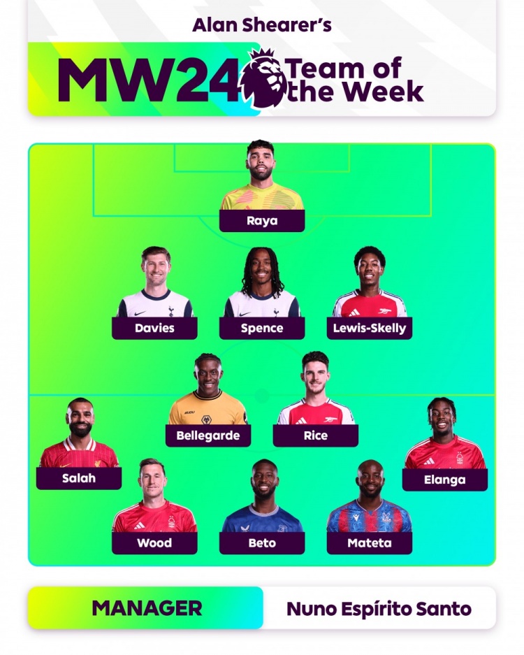 中場(chǎng):薩拉赫(利物浦)、貝萊加德(狼隊(duì))、賴斯(阿森納)、伊蘭加(森林)