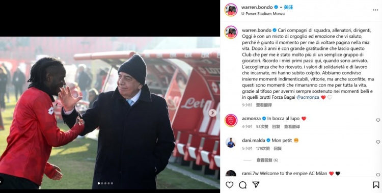 “對我而言,蒙扎不僅僅意味著一群球員。我還記得我剛來這里時(shí)所受到的歡迎,你們所體現(xiàn)的團(tuán)結(jié)和價(jià)值觀,立即打動了我。我們共同經(jīng)歷了很多難忘的時(shí)刻,有勝利也有失敗,這些瞬間將永遠(yuǎn)伴隨我一生。感謝球迷們在順境和逆境都始終不渝的支持,蒙扎加油!”