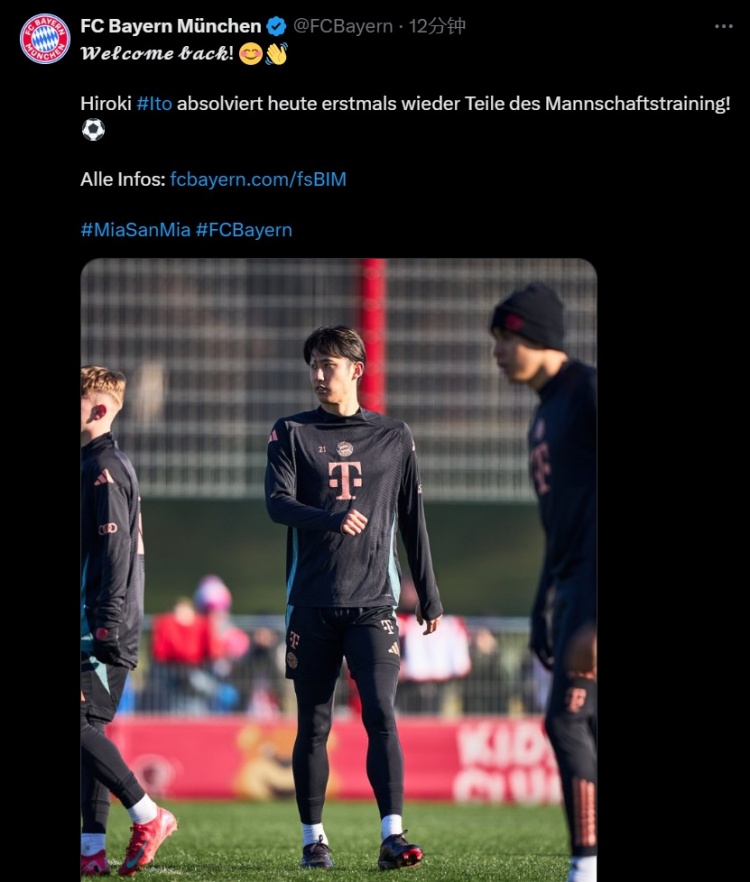 拜仁官網(wǎng)介紹稱,伊藤洋輝參加球隊合練,這也是這位日本新援自去年拓骨骨折后首次回歸合練。