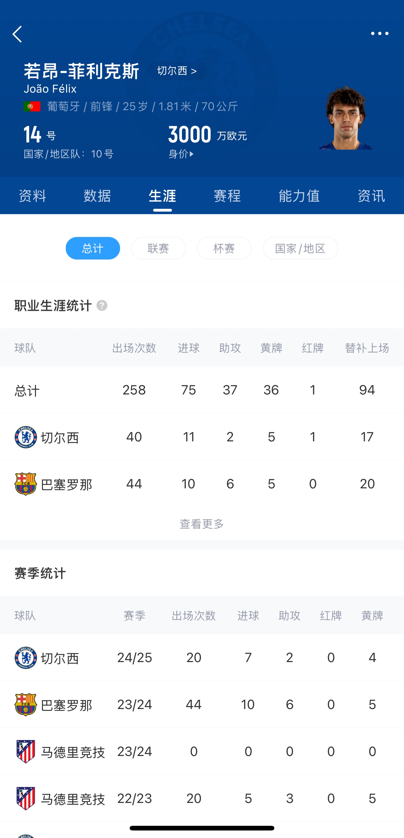 菲利克斯,現(xiàn)年25歲,葡萄牙前鋒,去年夏窗切爾西花費(fèi)5200萬(wàn)歐從馬競(jìng)簽下球員,本賽季菲利克斯共代表切爾西出戰(zhàn)20場(chǎng)比賽,貢獻(xiàn)7球2助,目前球員德轉(zhuǎn)身價(jià)3000萬(wàn)歐。