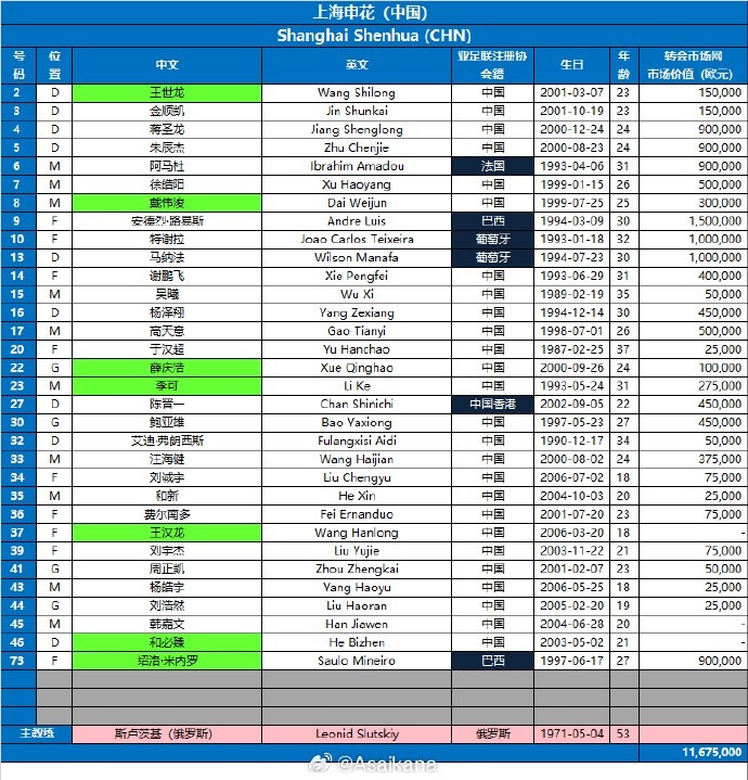 上海申花亞冠報(bào)名名單(綠色底紋代表對(duì)比第2報(bào)名窗口,此次報(bào)名窗口新增加的球員,圖源朱藝微博)
