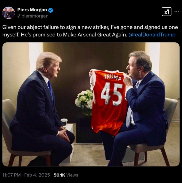 在特朗普第一段美國總統(tǒng)任期中,摩根曾在2018年為他進行了專訪,并且送上了代表其任期的阿森納45號球衣。