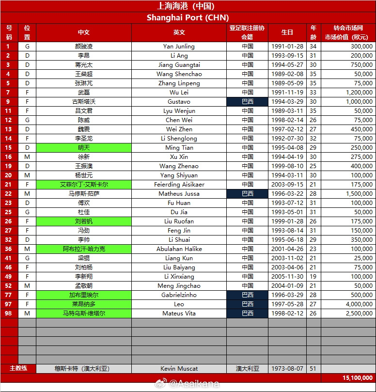 *注:1、綠色底紋代表對比第2報(bào)名窗口,此次報(bào)名窗口新增加的球員。2、亞冠精英聯(lián)賽規(guī)定不晚于3月31日前,只要名單不滿35人上限,仍允許補(bǔ)報(bào)2月4日后新轉(zhuǎn)入的球員。3、由于賽制不同,亞冠精英聯(lián)賽球衣號碼、報(bào)名人員不一定與中超完全相同,請注意區(qū)分。4、該名單將生效至本賽季亞冠精英聯(lián)賽結(jié)束。