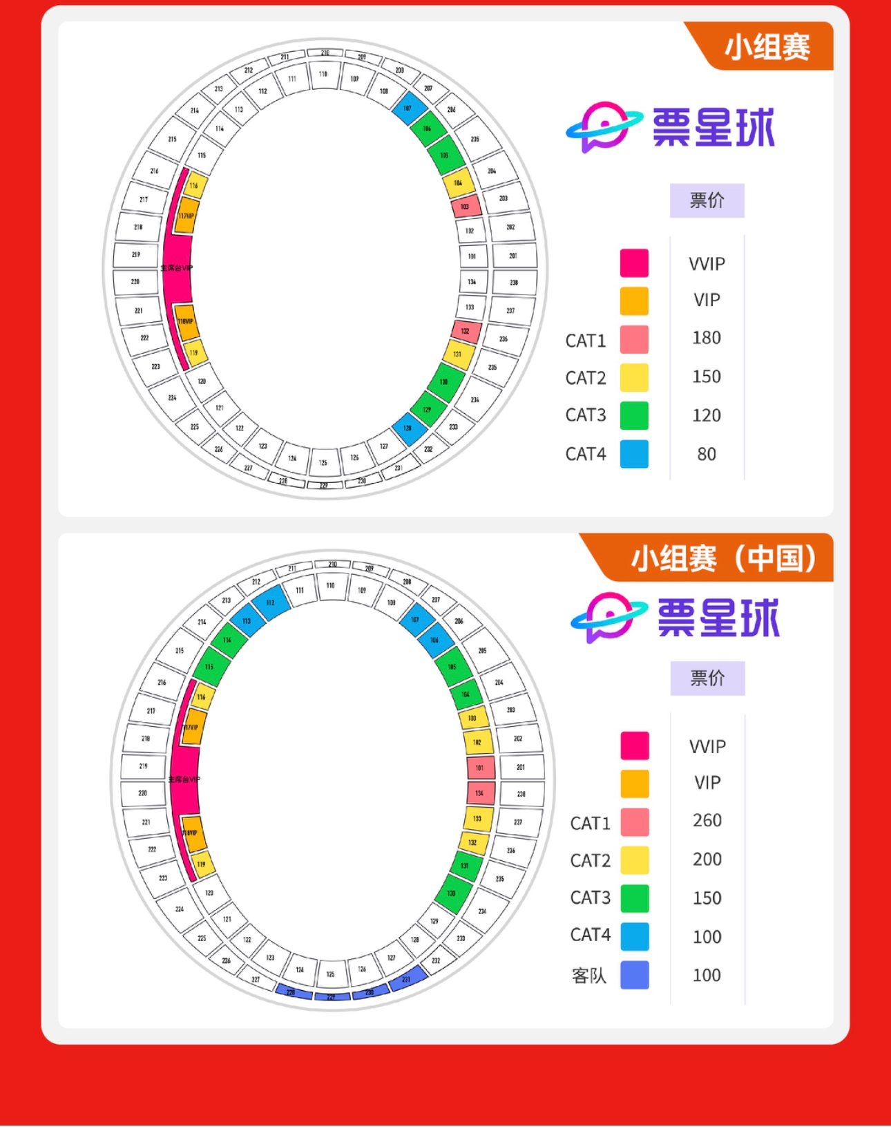 票務(wù)平臺顯示,小組賽階段,中國隊比賽常規(guī)票價目前為100-260不等,其他比賽票價為80-180不等。
