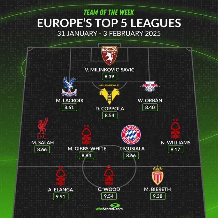 2月5日訊 本周五大聯(lián)賽已經(jīng)完賽,whoscored也統(tǒng)計(jì)了本周評(píng)分最佳陣容,諾丁漢森林4將在列。