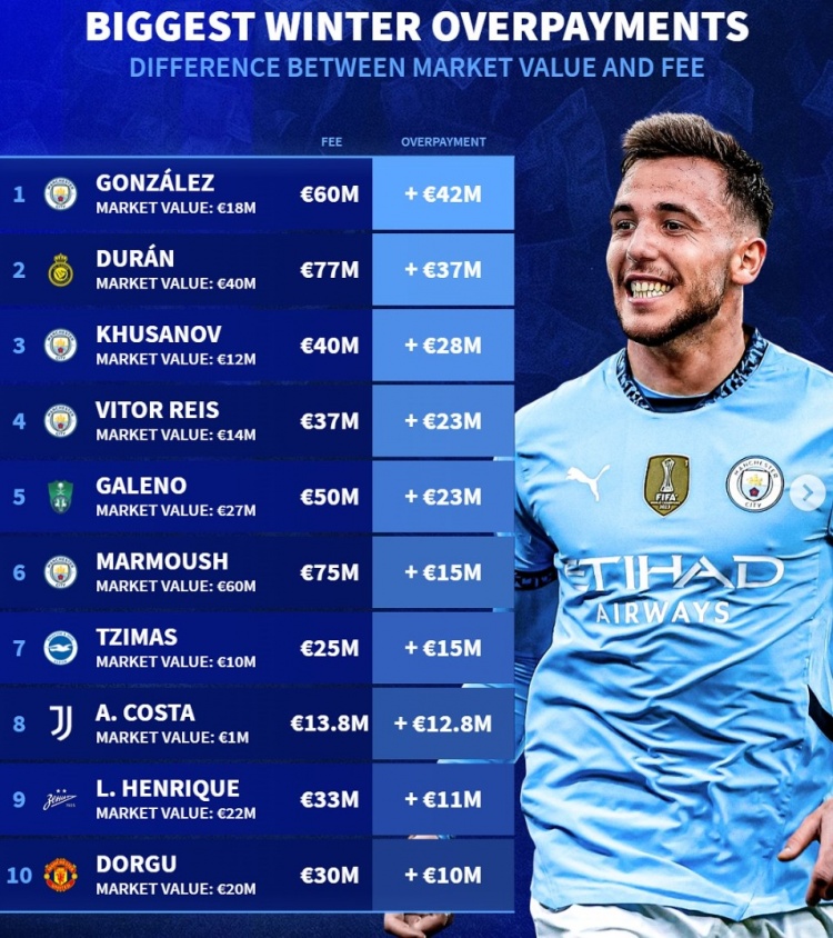 2月5日訊 五大聯(lián)賽冬窗已經(jīng)結(jié)束,《轉(zhuǎn)會(huì)市場》也列出了冬窗溢價(jià)引援榜,前六中曼城占據(jù)4席。
