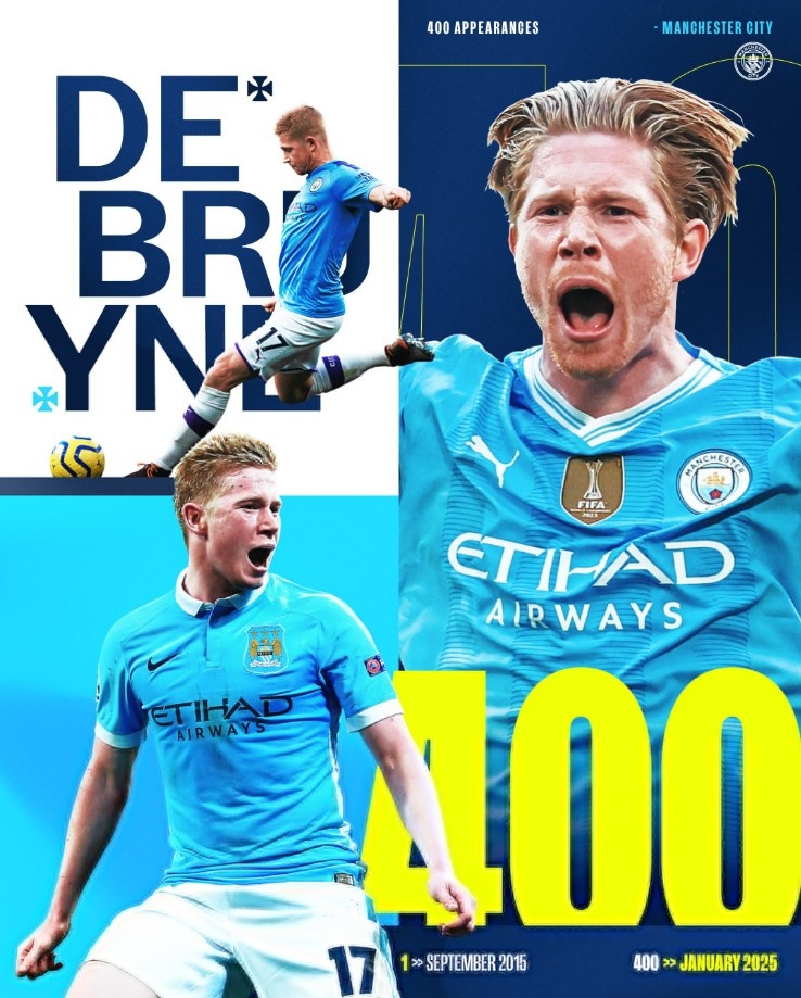 據(jù)曼城官方數(shù)據(jù)統(tǒng)計,本場比賽將是德布勞內(nèi)代表藍(lán)月亮出戰(zhàn)的第400場比賽。曼城在社交媒體曬出了德布勞內(nèi)400場字樣的海報,慶祝這一里程碑,并配文寫道:“德布勞內(nèi)即將迎來代表曼城出戰(zhàn)的第400場比賽?!?/p>