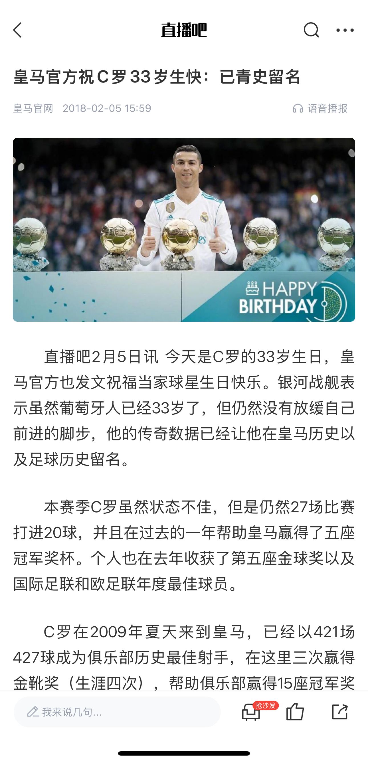 發(fā)布時間:2025年02月05日 10:50點(diǎn)擊:欄目:足球新聞 相關(guān):白衣傳奇!皇馬官方祝C羅40歲生日快樂:每一位皇馬人都為你自豪 除特別注明外,本站所有內(nèi)容均為九球直播整理排版,轉(zhuǎn)載請注明出處:7年了皇馬官方發(fā)文祝C羅40歲生日快樂2018年離隊(duì)后首次 本文標(biāo)簽: 足球 西甲 皇家馬德里 C羅 利雅得勝利