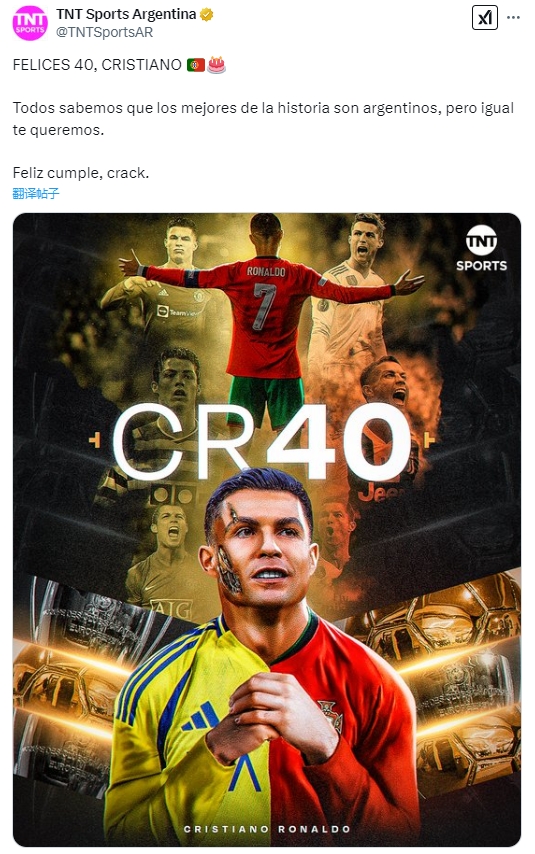 發(fā)布時(shí)間:2025年02月05日 11:50點(diǎn)擊:欄目:足球新聞 02月05日訊 今天是C羅的40歲生日,TNT體育阿根廷頻道發(fā)文為C羅慶生。TNT體育阿根廷頻道寫道:克里斯蒂亞諾,40歲生日快樂 除特別注明外,本站所有內(nèi)容均為九球直播整理排版,轉(zhuǎn)載請注明出處:TNT體育阿根廷頻道為C羅慶生:GOAT都是阿根廷人,但我們依然愛你 本文標(biāo)簽: 足球 C羅 梅西 利雅得勝利