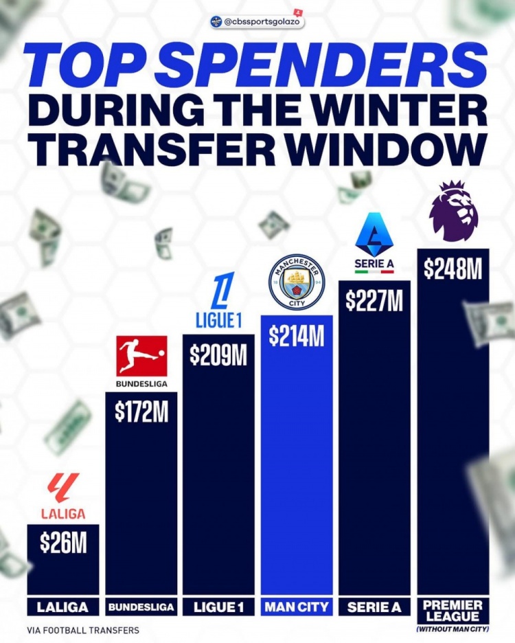 破費2.18億歐元簽入5名球員,超過西甲、德甲和法甲整個聯(lián)賽的花費,僅支付的溢價便超過1億歐元,過去的這個冬窗是屬于曼城的獨角戲,瓜迪奧拉已經(jīng)做好了圍繞哈蘭德進行全面重建的準備。