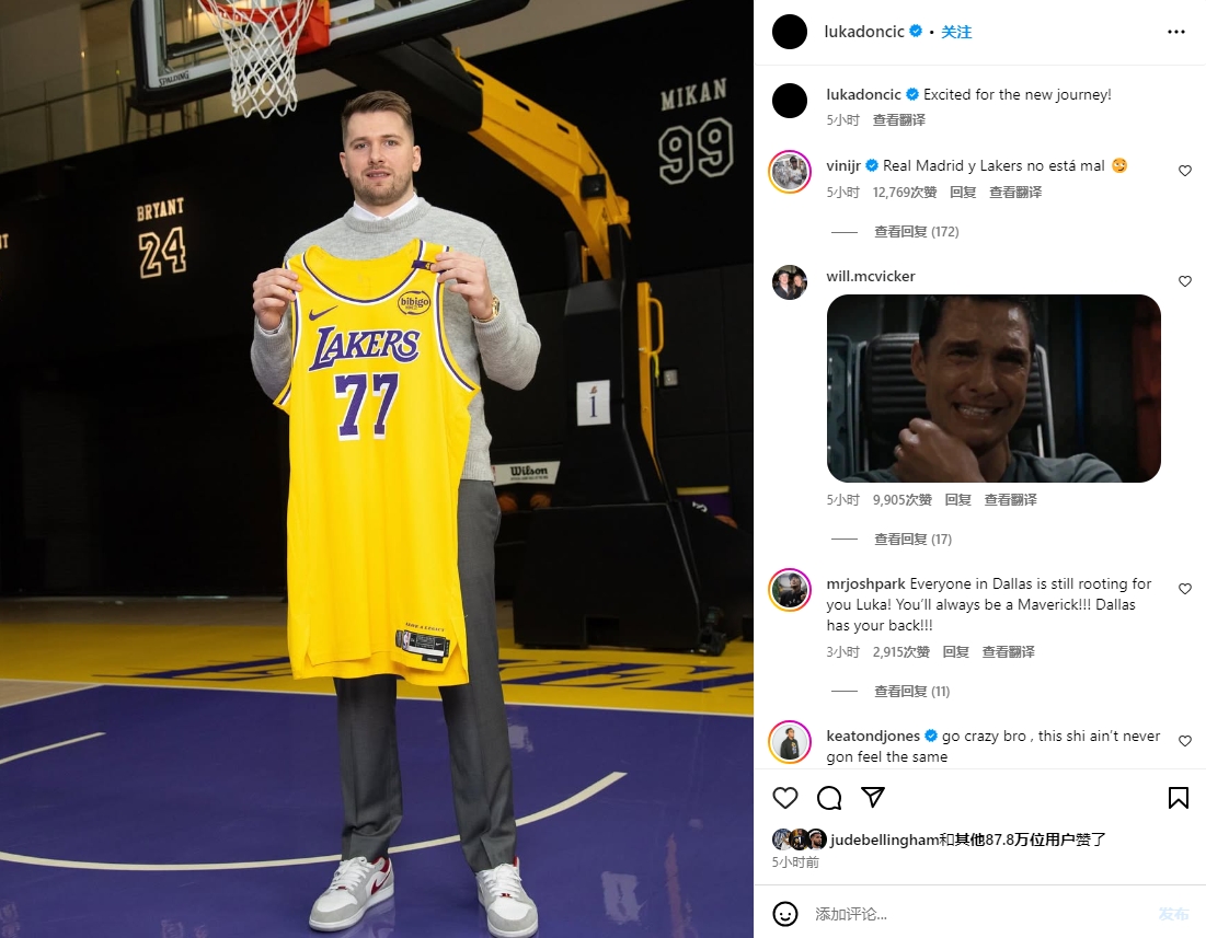 維尼修斯點(diǎn)贊東契奇社媒,并評論:“皇家馬德里和湖人都不錯(cuò)