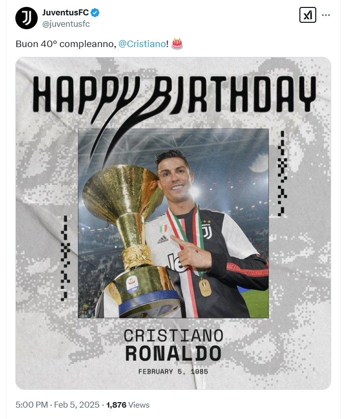 發(fā)布時(shí)間:2025年02月05日 17:50點(diǎn)擊:欄目:足球新聞 2月5日訊 今天是C羅的40歲生日,尤文官方更新動(dòng)態(tài),向C羅表示了祝賀。尤文官方表示道:祝賀C羅40歲生日快樂! 除特別注明外,本站所有內(nèi)容均為九球直播整理排版,轉(zhuǎn)載請(qǐng)注明出處:尤文官方更新動(dòng)態(tài),祝賀C羅40歲生日快樂 本文標(biāo)簽: 足球 意甲 尤文圖斯 C羅